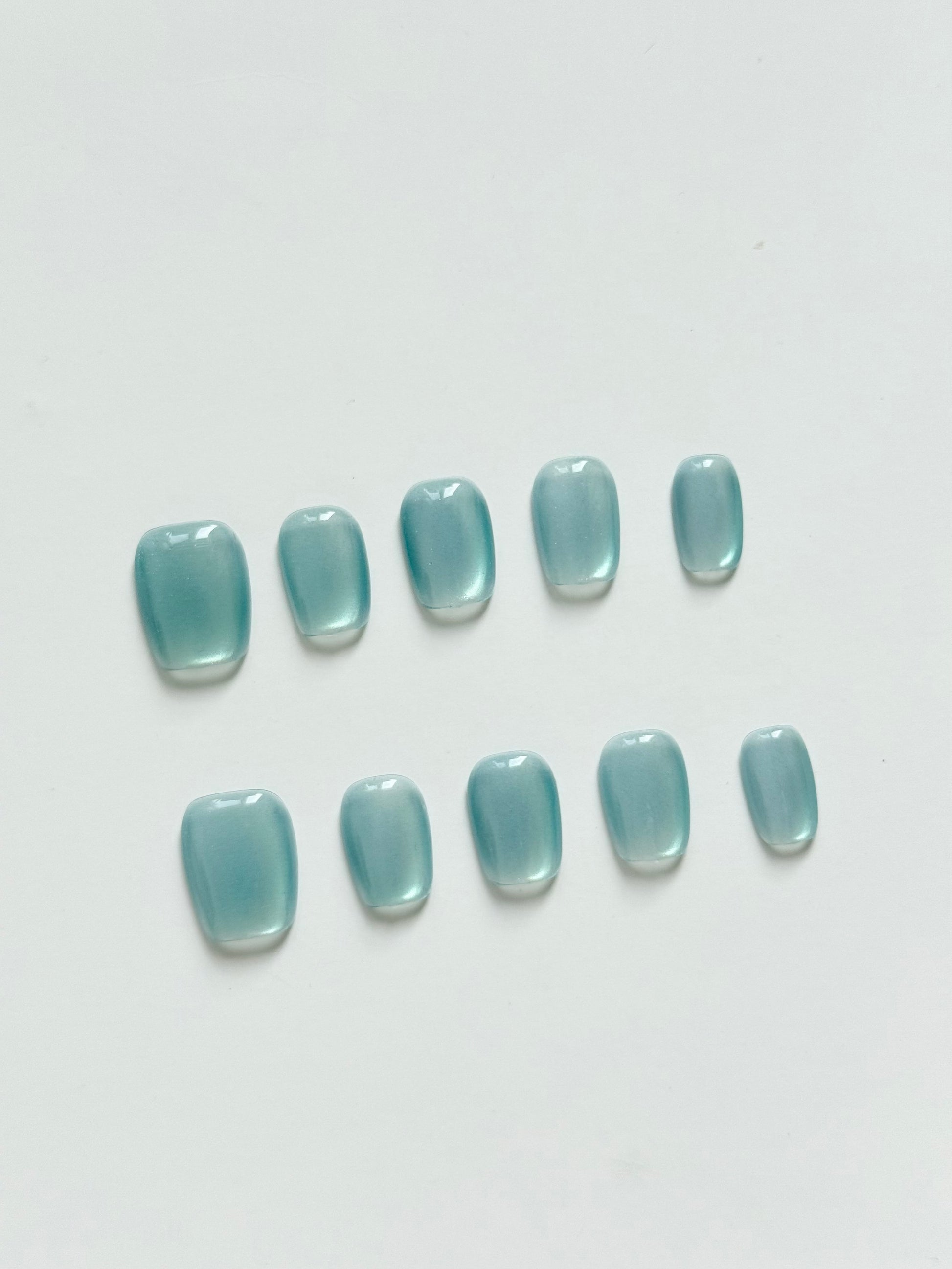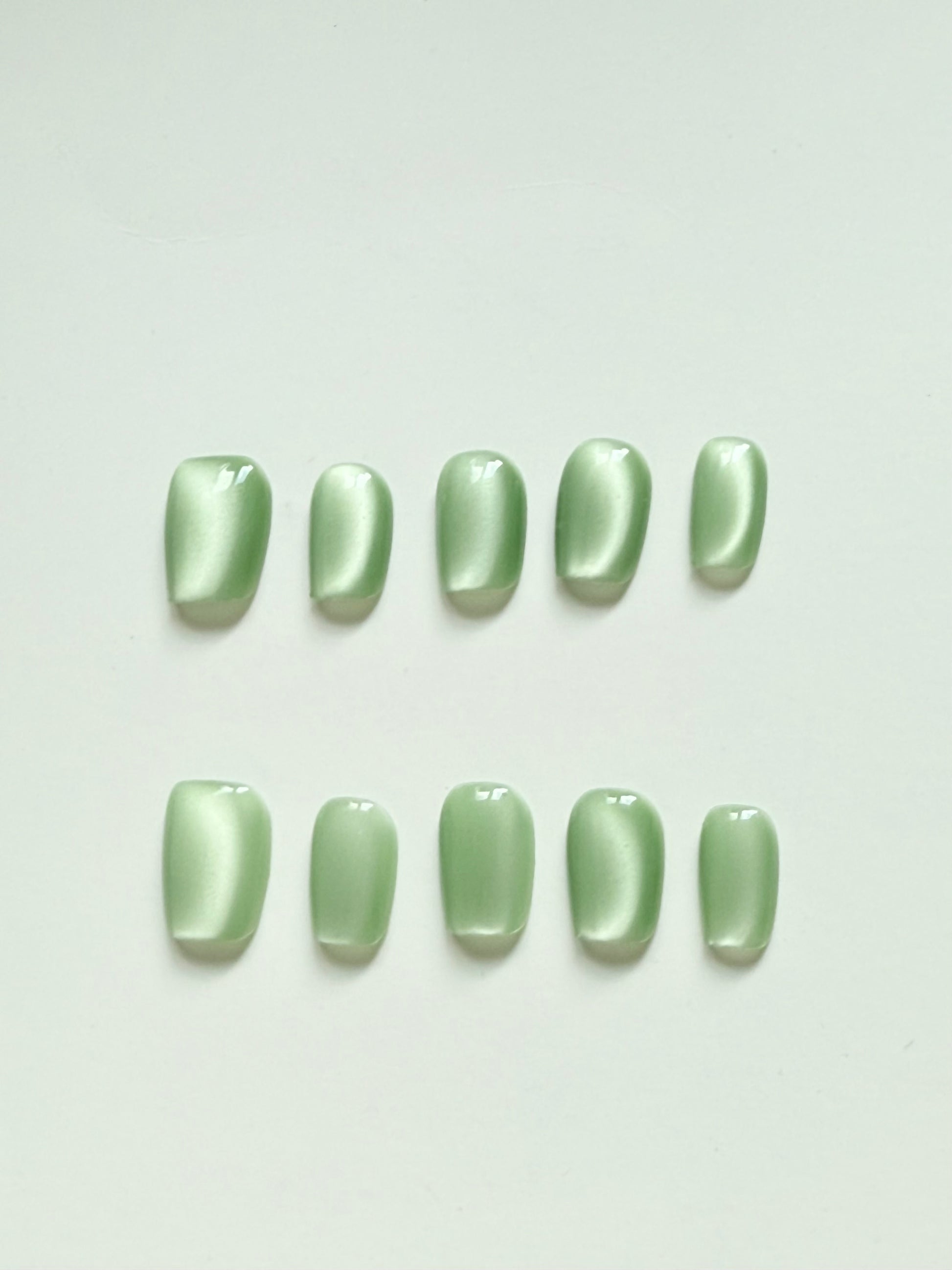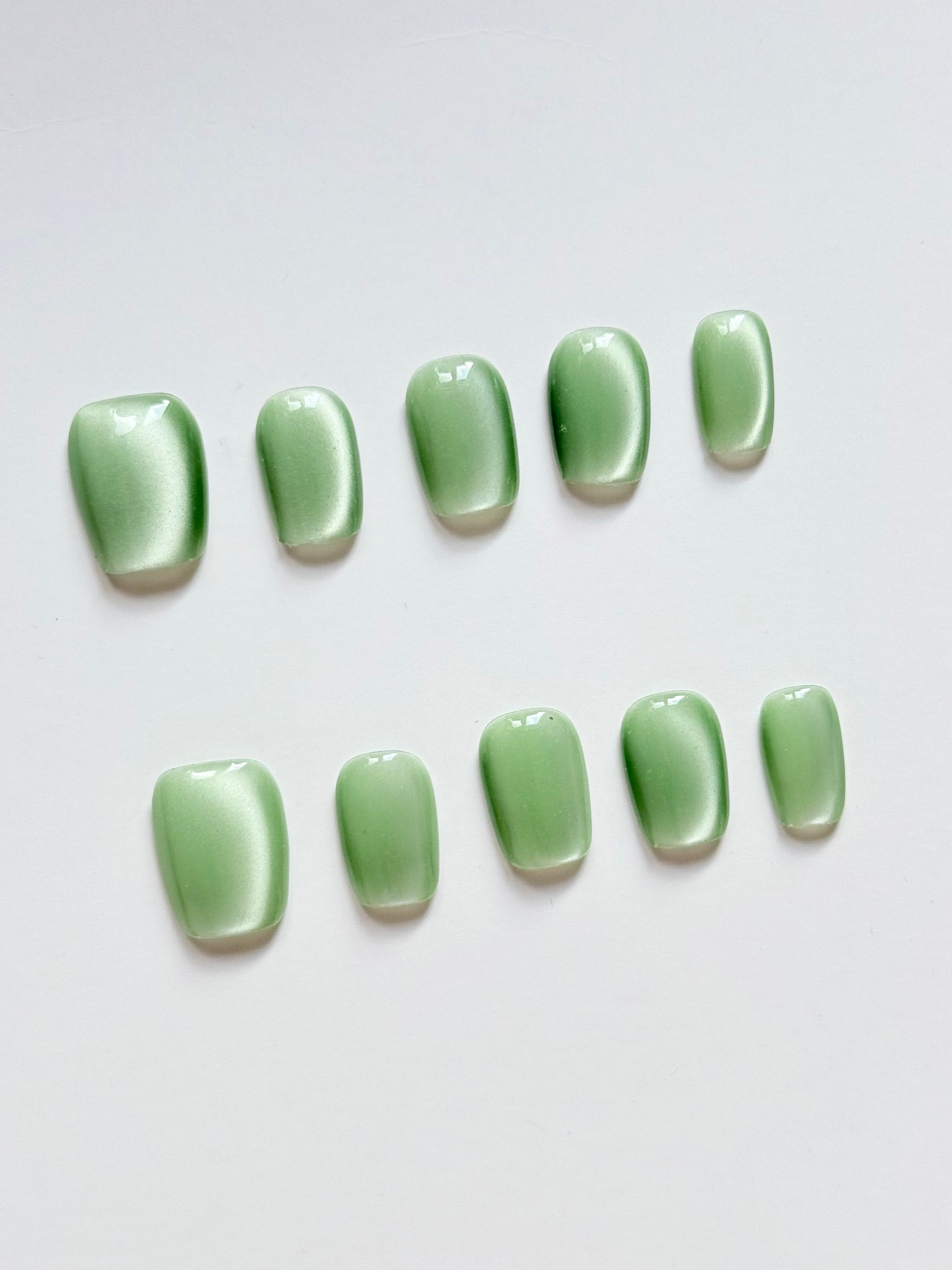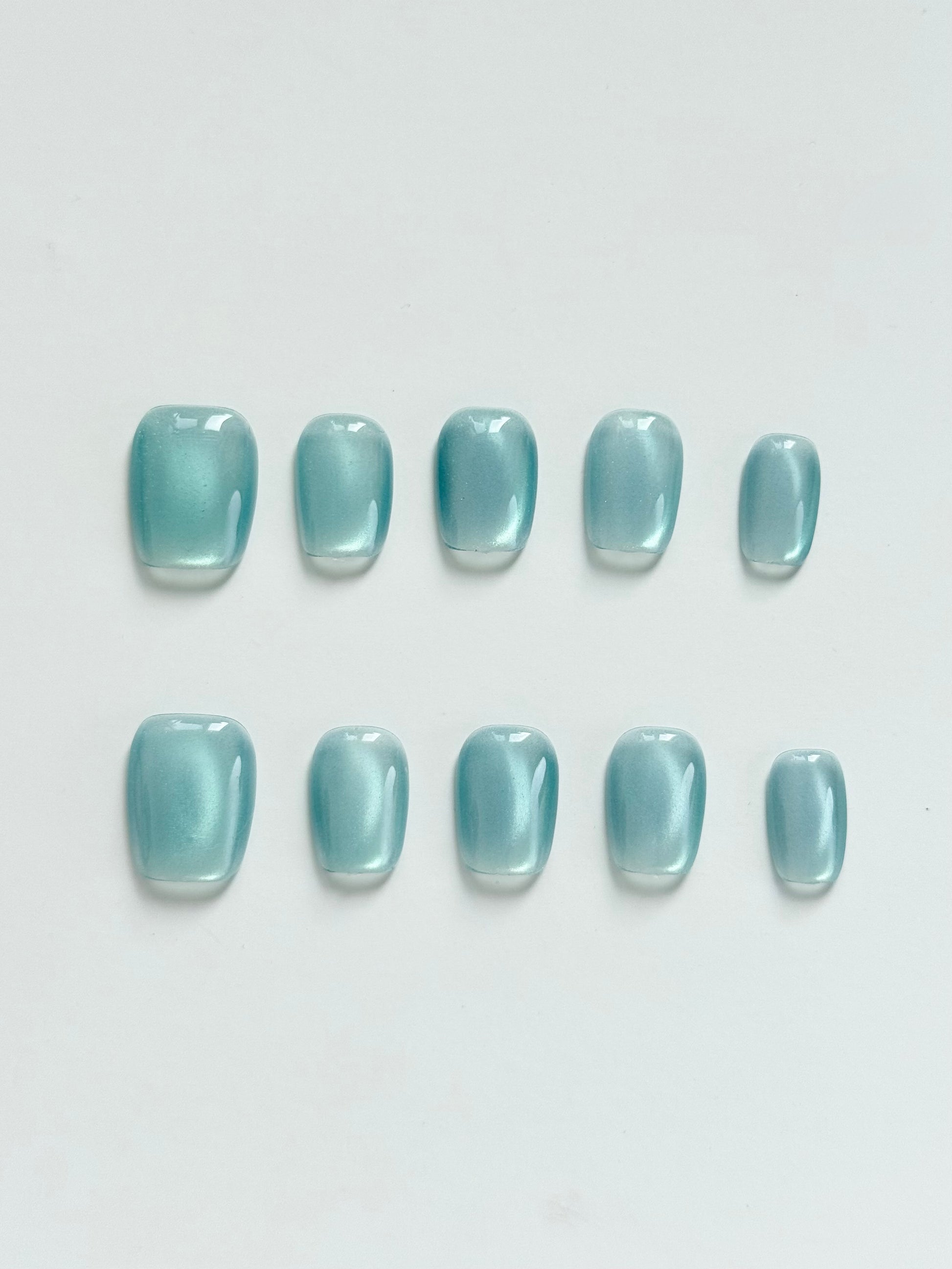 Inspired by the calm beauty of nature, this short square Cateye nail set blends soft pink, lake blue, tender green, and vibrant green hues. Each nail features a mesmerizing shade-shifting CatEye effect
