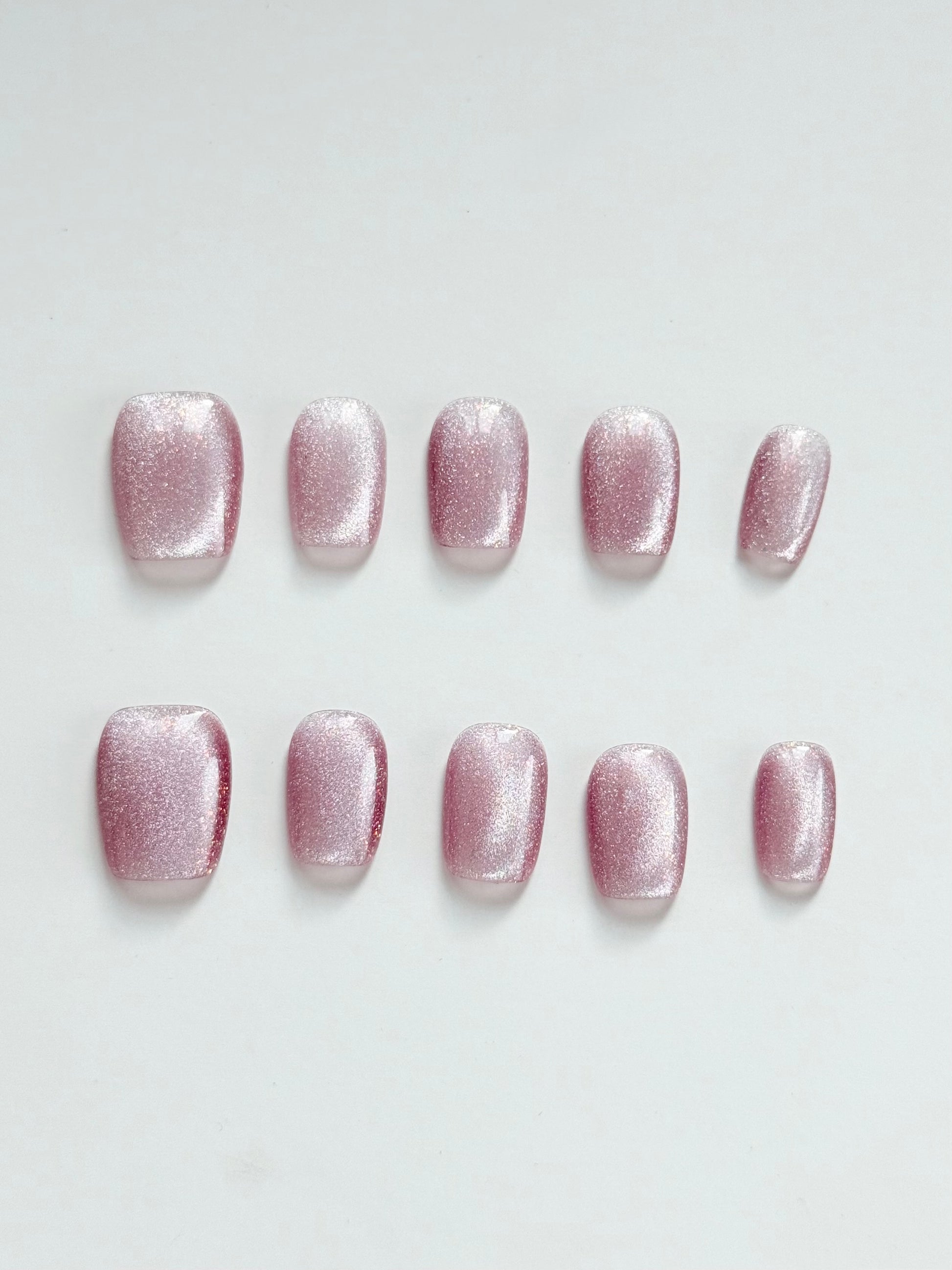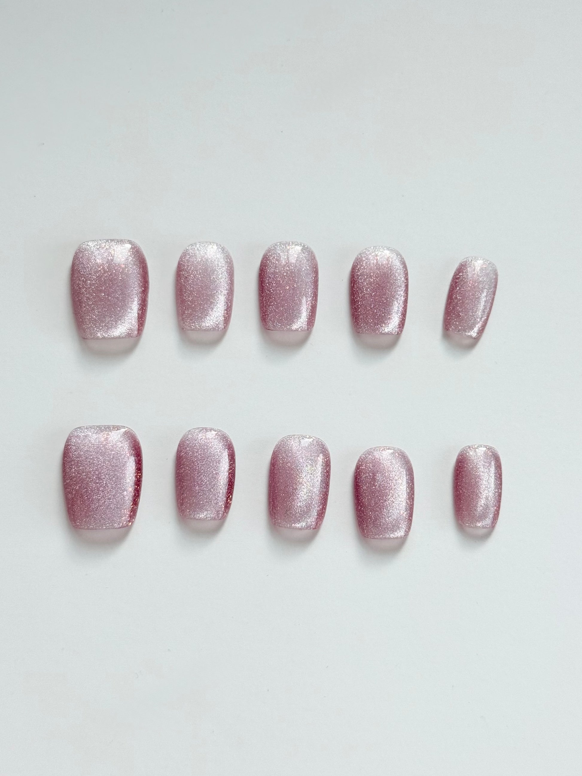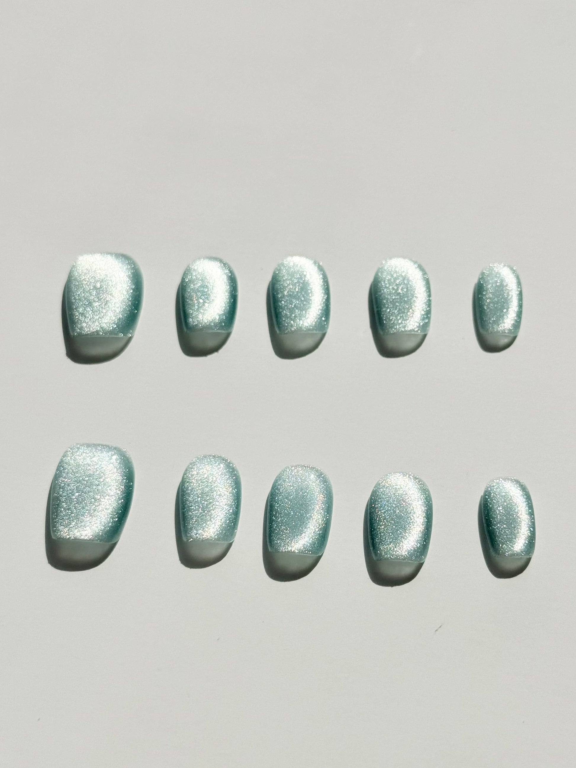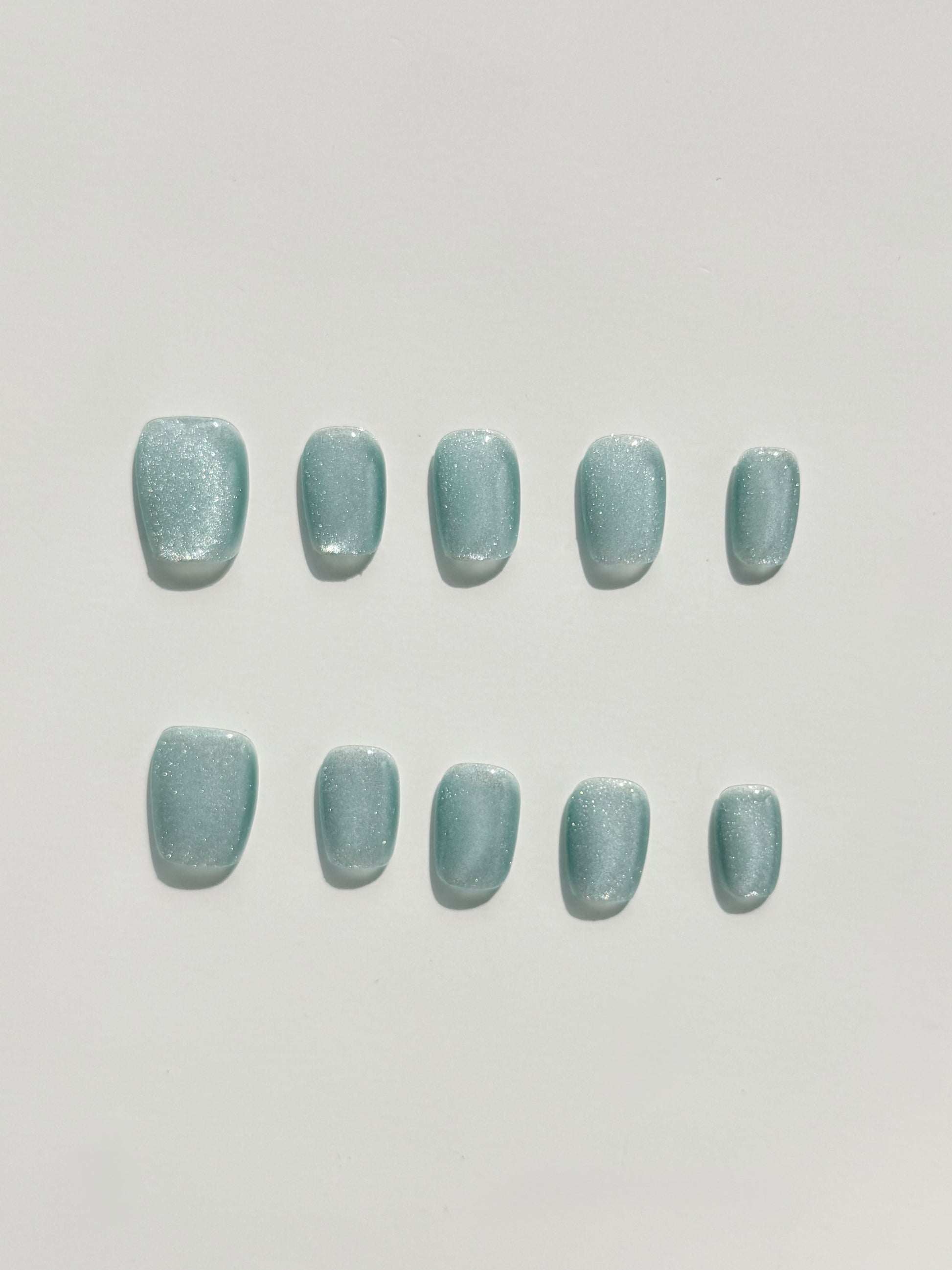 Inspired by the calm beauty of nature, this short square Cateye nail set blends soft pink, lake blue, tender green, and vibrant green hues. Each nail features a mesmerizing shade-shifting CatEye effect